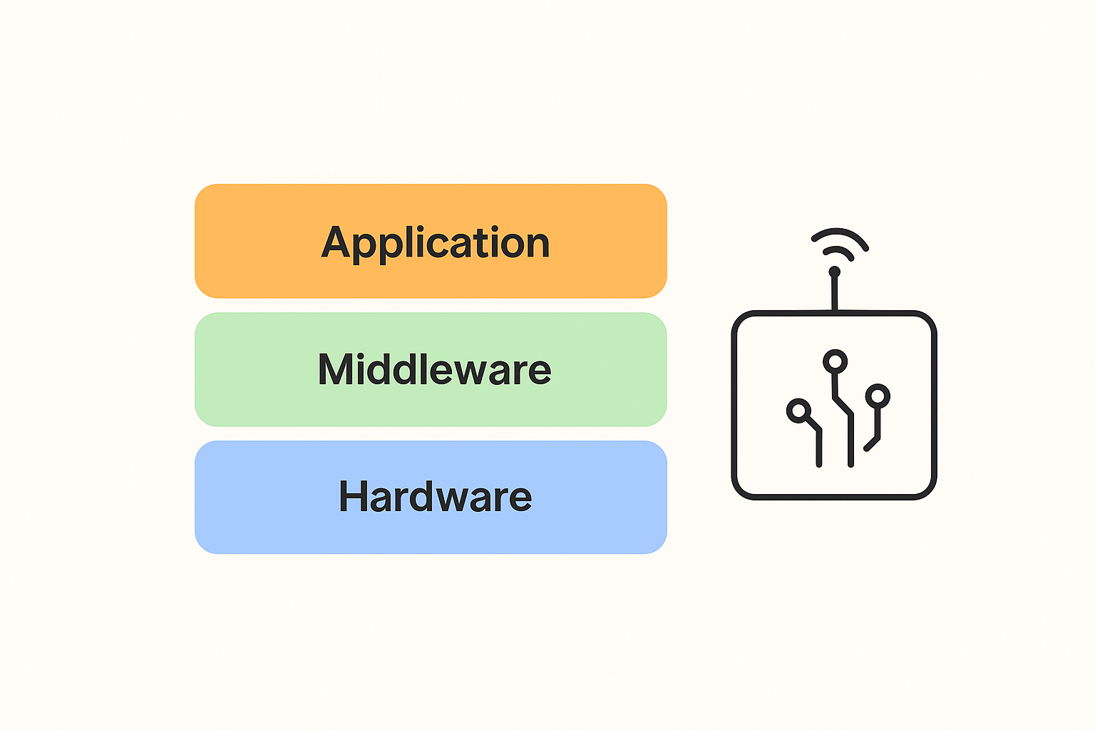 提案画像: 組み込みソフトの構造をイメージした図で、ハードウェア層、ミドルウェア層、アプリケーション層を重ねて示す構成図。